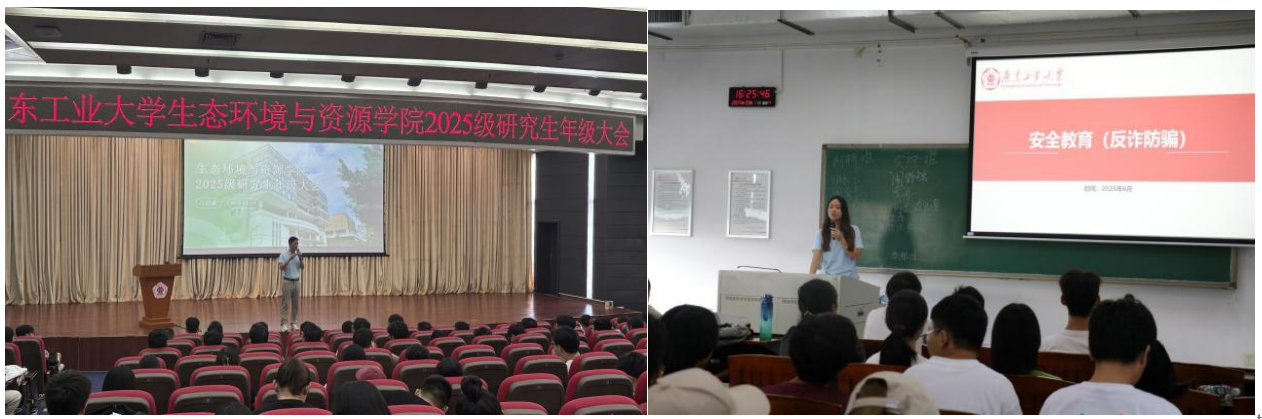 校园安全你我共建入学教育期间,学院研究生新生辅导员刁衍斌、本科生新生辅导员欧少珍分别组织召开了安全教育年级大会,从防诈骗防刷单、交通安全、宿舍用电与消防安全等多个维度,强调集体环境中自我防护与互助互警的重要性,引导同学们将安全知识转化为日常行为习惯,真正实现“安全意识入脑入心”。
