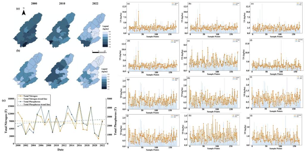 图3.图左为ECM-SWAT模型模拟的东江流域氮磷负荷的时空变化特征;图右为不同机器学习模型和GeoAI模型氮磷负荷模拟精度对比。