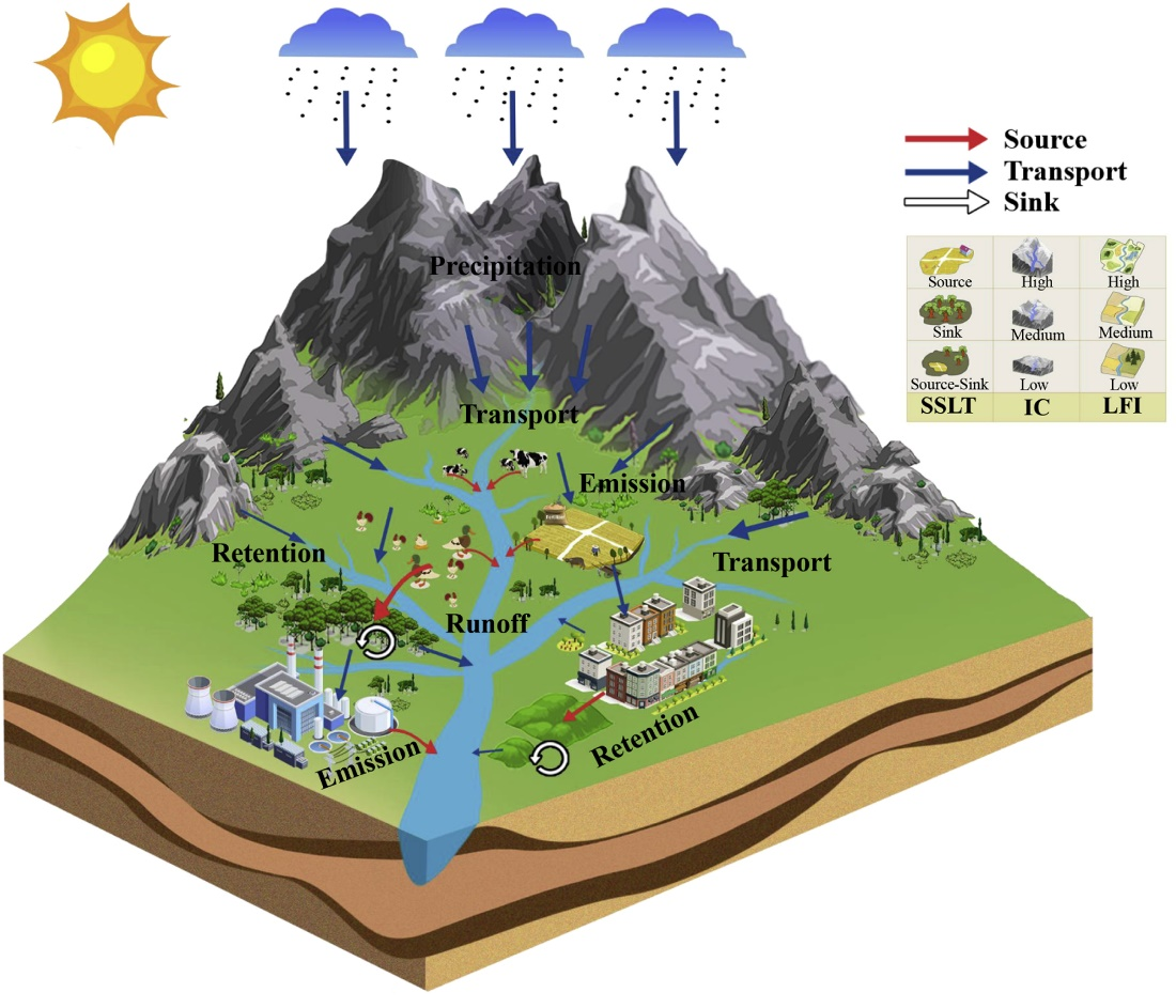 图1.影响流域面源污染负荷时空分异特征的“源-移-汇”机制示意图。