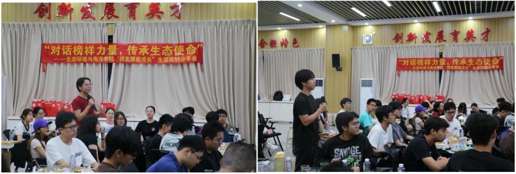 随后,莫丽华作“从校园到职场——环境生态专业就业与成长路径”主题演讲,结合自身十余年的从业经历,系统分享了生态环境科研领域的发展趋势、核心岗位能力要求以及职业晋升路径。她特别强调了在校期间夯实专业基础、积极参与科研项目的重要性,鼓励同学们主动关注行业动态,培养解决实际问题的能力;陈逸文围绕“团结、经历、方向、心态”四大核心维度,结合自身多元化的职业轨迹,生动讲述了专业学习与岗位实践的衔接经验,分享了求职面试的技巧与心得,建议同学们尽早明确发展方向,有针对性地提升综合素质。